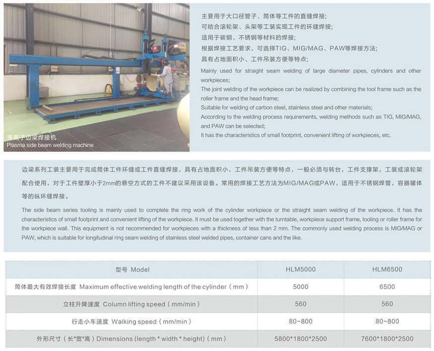 本邊梁式筒體專用焊接機是一種專門用於筒體縱縫和環縫焊接的專用設備,自動化程度高,該設備結構先進,功能齊全,控製靈活,操作方便,是提高產量的理想設備。本焊接專機主要由邊梁焊接機、背氣保護係統、滾輪架、MIG/TIG/等離子焊機及電氣控製係統等部分組成,同時可以配成等離子+氬弧焊的雙焊機組合,可實現打底焊接雙重功能。