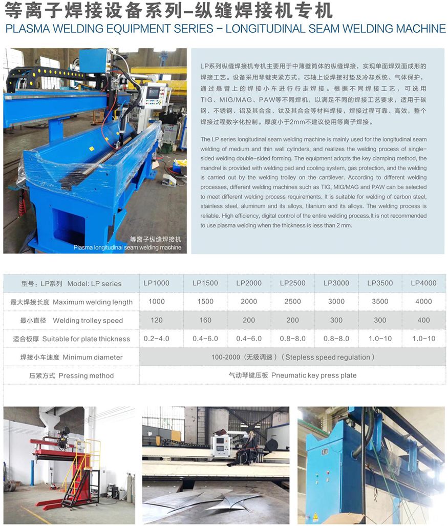縱縫自動焊機設計采用琴鍵壓緊式機構,提供均勻穩定的工件夾持和冷卻效果,大梁和焊接小車提供精密的焊接動作,用於進行高質量、低變形的直線性焊縫的焊接應用。工件的形式、形狀和材質可以不同,大多數情況下,焊縫是對接接頭設計。針對不同的應用,縱縫焊接係統可以集成的焊接方式有:GTAW(鎢級氬弧焊);PAW(等離子焊);GMAW(熔化極氬弧焊);FCAW(藥芯式熔化極弧焊);SAW(埋弧焊);YAG激光焊接等。