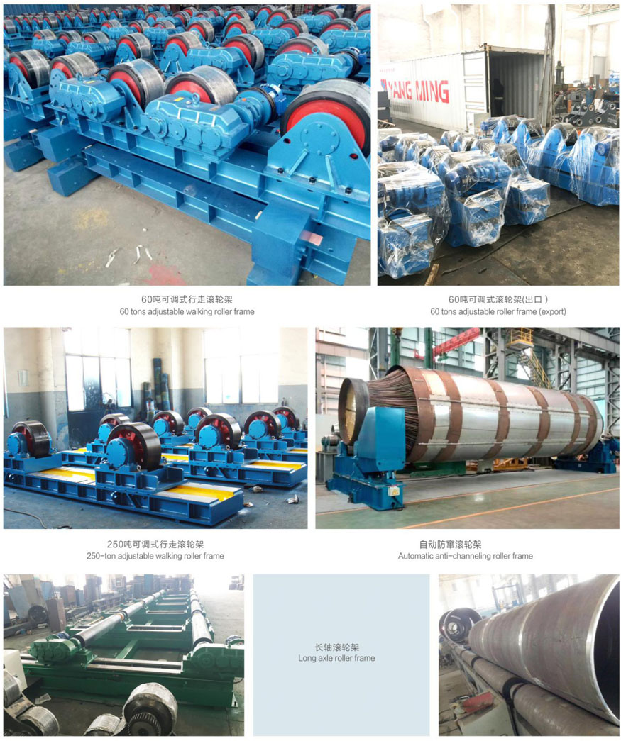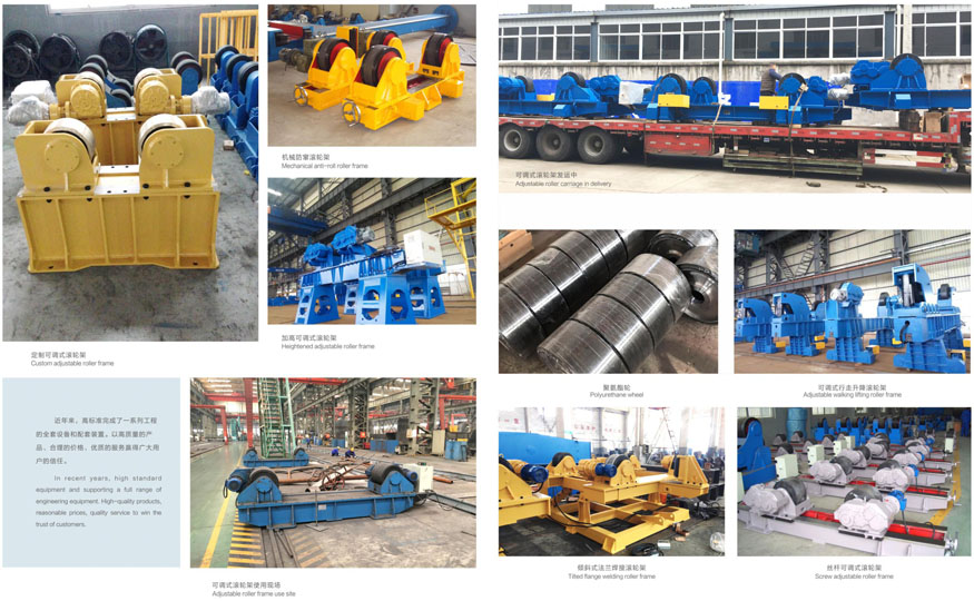 我公司生產的滾輪架主要有:20T白橡膠滾輪架、40T白橡膠滾輪架、電動行走自調式滾輪架、40T變頻調速滾輪架、80T電動行走自調式滾輪架、懸臂焊接中心